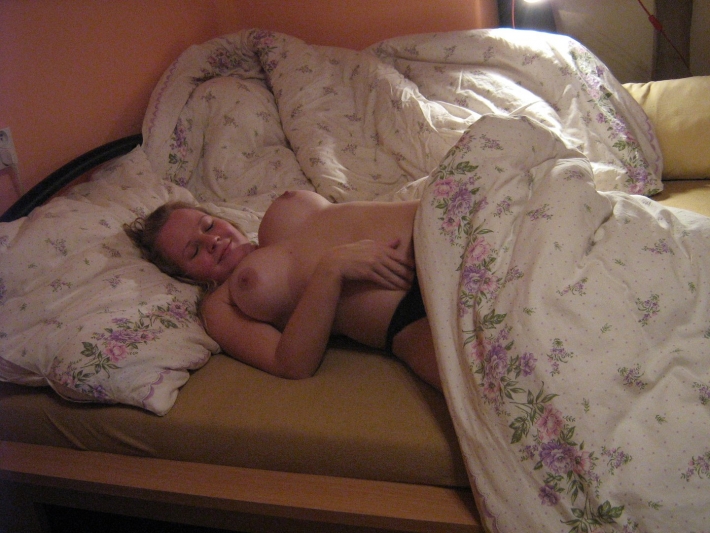 Проснувшись дома, жена увидела, что муж стоит и смотрит на нее, совсем голый. Ей так понравилось увиденное, что она решила немного поиграть со своим наблюдателем не выходя из своей мягкой красивой кроватки. Она стала в позу, став на коленки и потянулась к узорчатой спинке дивана и повернула назад головку, чтобы посмотреть на реакцию мужа. Увиденное настолько понравилось ей, что она вскочила и расставила ножки еще шире чтобы показать ему свои горячие прелести, которые уже заждались его.