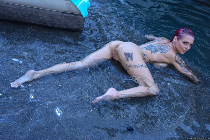 Поистине прекрасная и полностью обнаженная модель с яркими привлекательными татуировками на разных местах тела и с милой улыбкой на лице неугомонная Анна Белл Пикс заводит публику. Танцуя жаркий стриптиз в воде и эротично крутя большой привлекательной задницей, симпатичная телка не оставляет попыток вызвать бурю восторгов у самых достойных гламурных мачо. Рыжая красотка, оставшись без бикини, сможет с легкость покорить и подчинить всех мужиков сразу.