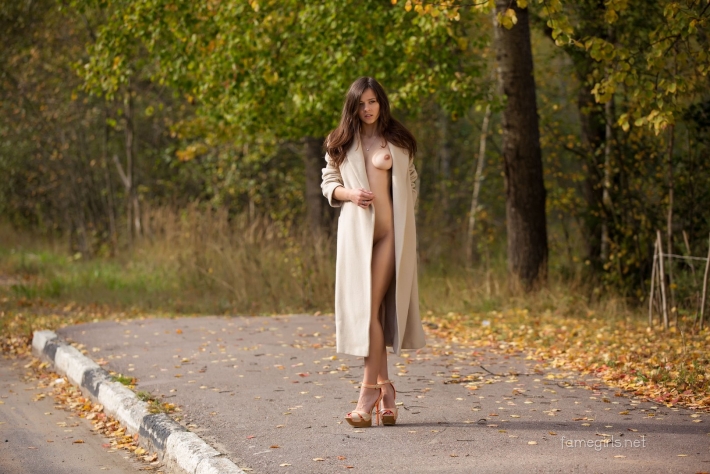 Безумно сексапильная и раздетая телка с большими силиконовыми титьками решила пойти погулять по парку и под верхнюю одежду ничего не одевать, даже нижнее белье. Прекрасная фифочка в ярком плаще для большего эффекта раскрывает зонтик и выглядит очень гламурно на свежем воздухе, флиртуя выразительными глазками с прохожими. Сложно не попасть в сладкие и опасные сети сексапильной девицы, которая максимально откровенно сверкает силиконовыми титьками в общественном месте.