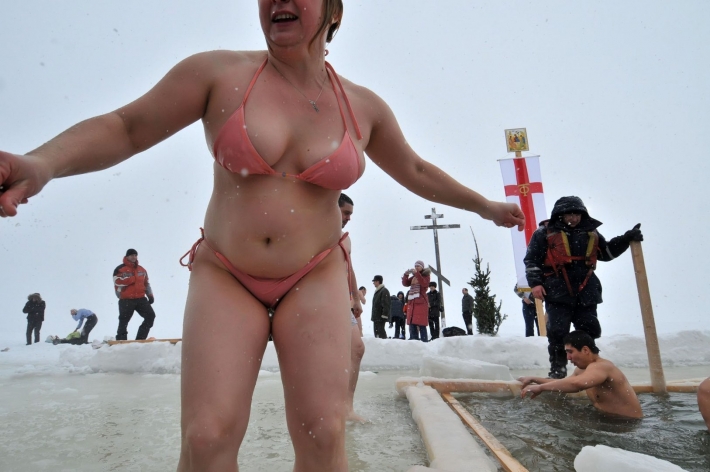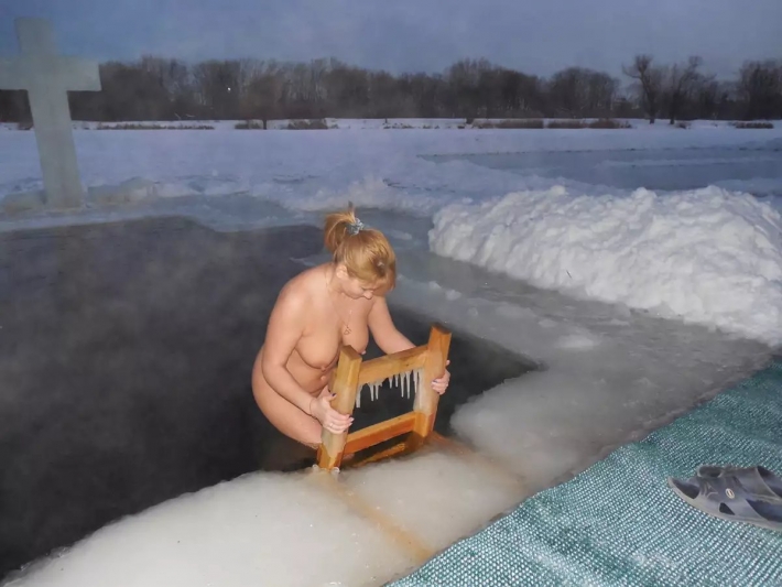 Симпатичная и совершенно голая женщина решила побить рекорды, когда спустилась в холодную прорубь и довольно улыбнулась. На Крещение зрелая красотка сексуально трясет натуральной грудью перед зрителями и демонстрирует силу духа, ведь зайти в ледяную воду зимой осмелится не каждая барышня. Неугомонная дамочка с привлекательными висячими титьками и с пушком на взрослой пилотке совершенно непредсказуема и слишком возбуждена, поэтому холода даже не почувствовала.