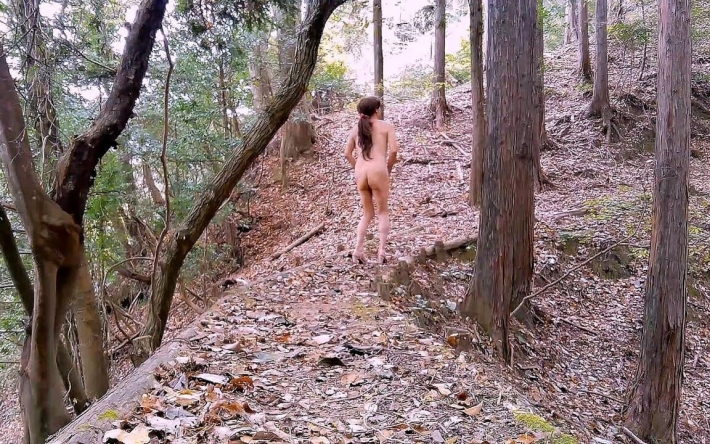 В сапожках, коротких шортиках и пятнистом бюстгальтере, восточная сучка, отправилась прогуляться в лес. Найдя укромное место возле камней, она обнажать свою грудь с темным соском, а затем стянув и шорты, облокотилась на валун и выставила заросшие вареники на обозрение.