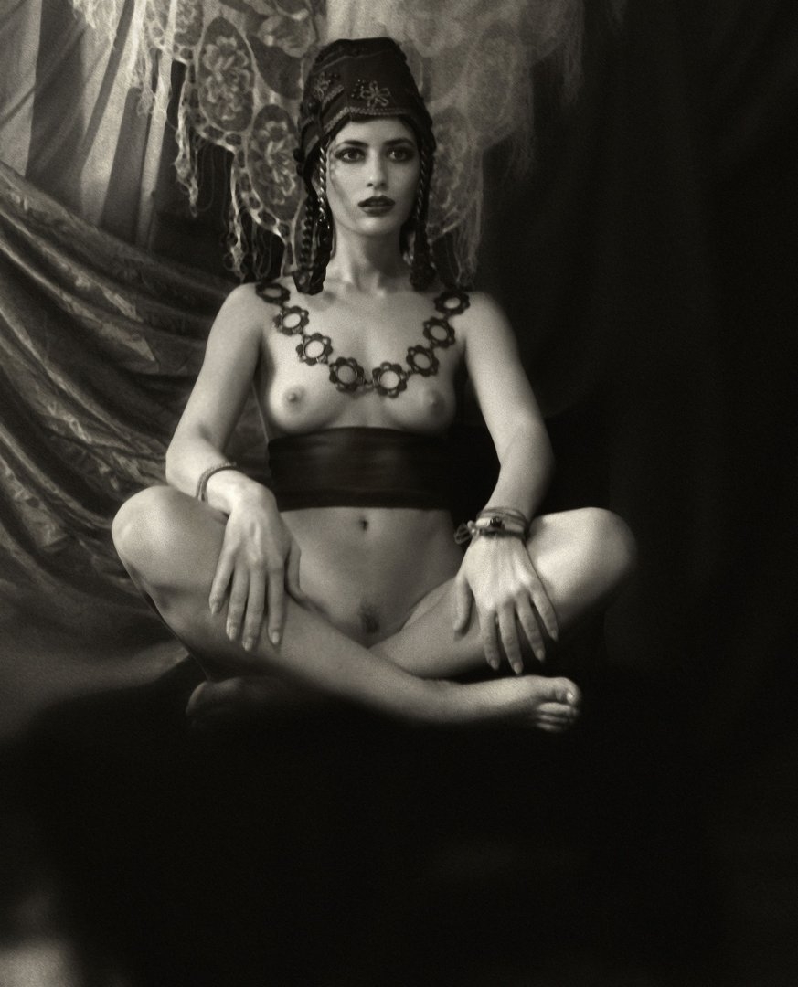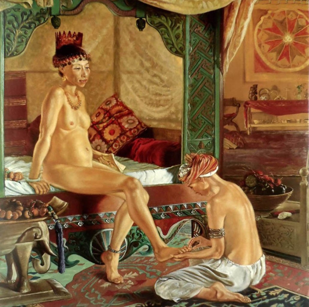 Волнушка с маленькой грудью присела передохнуть в кресло. Вокруг нее комната выполненная в стиле средневековья. черные, кудрявые волосы рекой спадают с ее головы. Личико, очень милое, с красивыми губками-бантиками, застывшими в подобие улыбки. Она вся в ожидании своего принца. Ножки широко расставлены на полу, застеленном зеленым узорчатым ковром. Между раздвинутых ног нагло смотрит красивая, аккуратная галушечка, в полном ожидании бурного секса. Она даже не снимает свои туфельки.