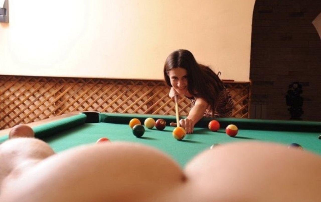 В этой игре нет победителей, зато телка, одержав победу все-равно наградит нас классной голой попочкой! Бильярд отличная игра, а кий в руках телочки такой гладкий и прохладный, что она невольно возбуждается от своих фантазий! Девушка бросает кий, чтобы снять платье и продолжить игру голой. А мы пока посмотрим на ее худощавые, но очень вкусные ягодицы и бедра. Худоба не вредит красавице и делает ее очень стройной и сексуальной и даже небольшие сиси - не преграда для красоты малышки! Она красива.