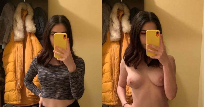 Студентка считается самой красивой девушкой в институте потому, что веселая одногруппница хорошо одевается и ее ножки в модных джинсах всегда секси. А вот сейчас она дома и устраивает праздник одногруппнику. Она не медлит и быстро снимает футболку, а следом за ней и черный лифчик. Красивые небольшие сиси, чуть провисшие, теперь на свободе, она сразу наклоняется и показывает, как они висят сексуально! Теперь очередь джинсов - штаны скользят вниз по загорелым стройным ножкам и там...нет трусиков!
