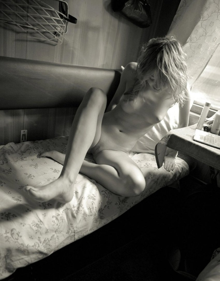 Совсем молодая студентка добирается до учебного заведения в скоростном поезде. Ещё рано, поэтому девушка сидит на сидении одна и ей не мешают. От скуки она подняла платье оголяя бритую киску, не обращая внимания на одиноких пассажиров девка продолжила развлекаться.