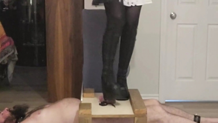 Настоящий трамплинг устроила симпатичная стройная девушку в чулках телесного цвета и на высоких каблуках. Девушка догнала парня, сбила с ног его и пока он не очухался она стянула с него трусы и давай издеваться на ним, от каблуков пострадали и хуй с яйцами.