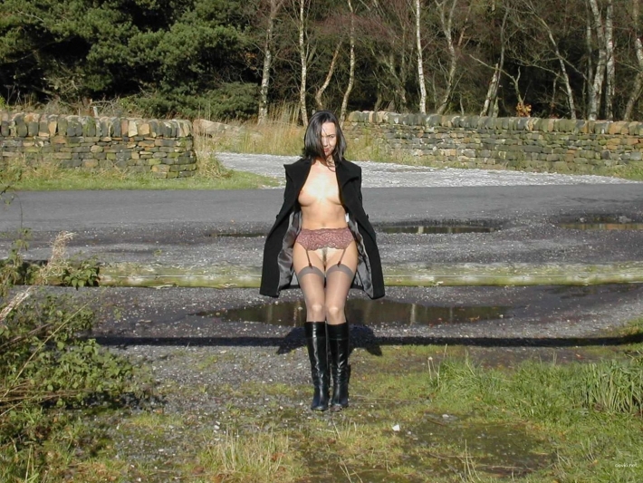 Невероятно, но всё же стоит набраться сил и взглянуть на эту обворожительную кудесницу, которая в одних сексуальных чулочках и плаще ходит по улице и светит раздетыми прелестями. Голая тёлочка даже слегка не смущается, что её видят мимо проходящие люди и буквально пожирают своими страстными глазами. Обнажённая соска постоянно меняет своё местоположение, чтобы вокруг неё не столпился народ и не помешал её эротическим планам похвастаться сладкими сиськами для народа.