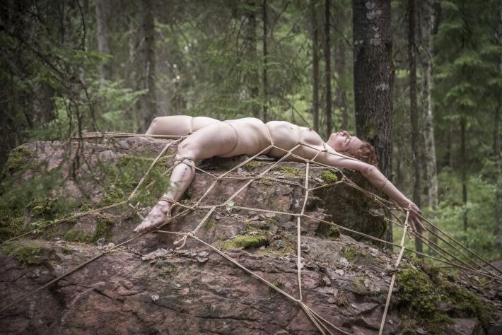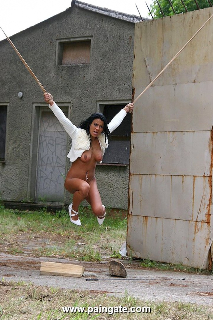 Симпатичную телочку поймали неизвестные и быстро раздели, привязали ее к дереву. Видимо злодеев спугнули, что они бросили красотку и сбежали. Девушка смогла после некоторых усилий развязаться и пока она искала одежду, на посмотрим на ее возбужденные соски и побритую писечку.
