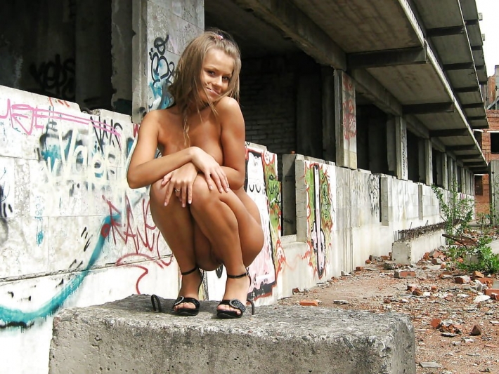 Молодая красавица в развалинах абсолютно голая смотрится бесподобно. Аккуратная киска и едва заметной интимной стрижкой приковывает взгляд. Голая девушка на фоне обшарпанных стен выглядит беззащитной и супер сексуальной. У молодой сучки отличная фигура и сиськи.