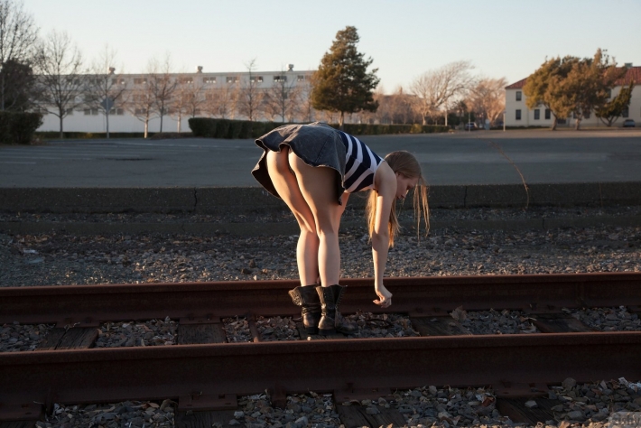 Девушка решила в таком сексуальном наряде прокатиться на поезде. В качестве оплаты за проезд машинист состава попросил ее раздеться, ей не привыкать и согласие было дано. Она показала здоровенные буфера, стройные очки в чулках с крупной сеткой и мандушку.